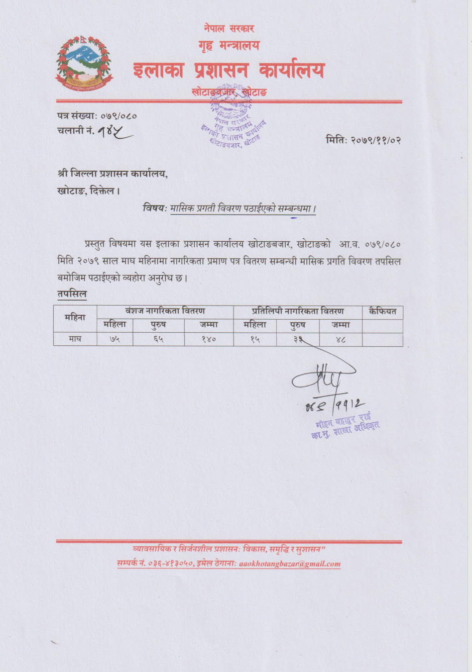 २०७९/०८० माघ महिनाको मासिक प्रगति विवरण