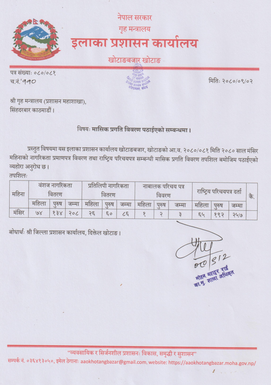 आ.व. २०८०/०८१ कात्तिक महिनाको मासिक प्रगति विवरण